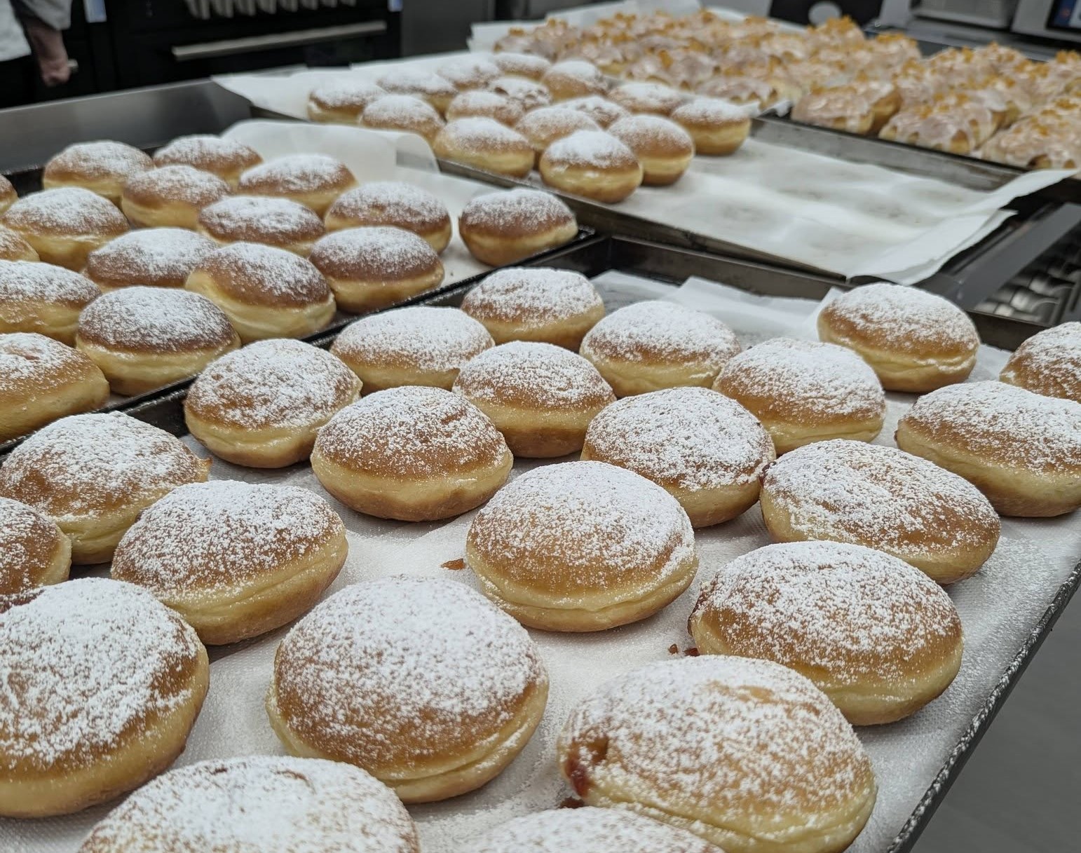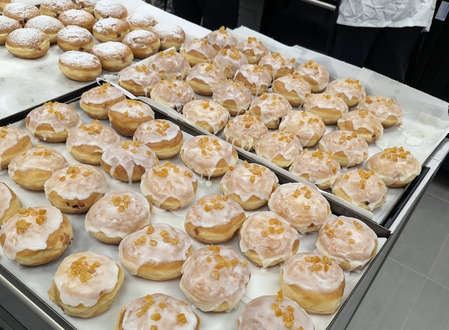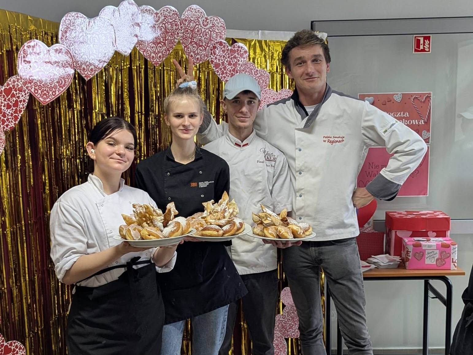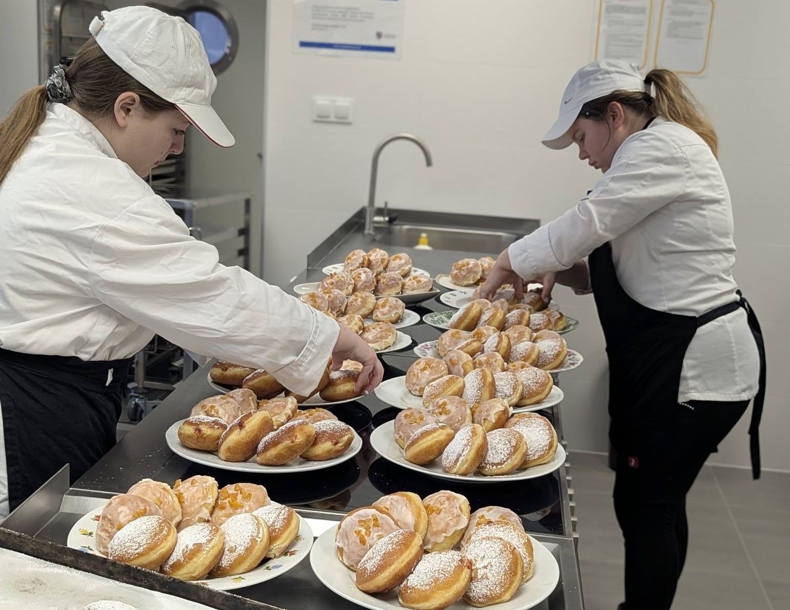 W pracowni było intensywnie i bardzo pracowicie – uczniowie usmażyli prawie 150 pączków i tyle samo faworków. Było dużo zaangażowania, dobrej energii i prawdziwego zespołowego działania – dokładnie tak, jak powinno wyglądać świętowanie w szkole gastronomicznej.